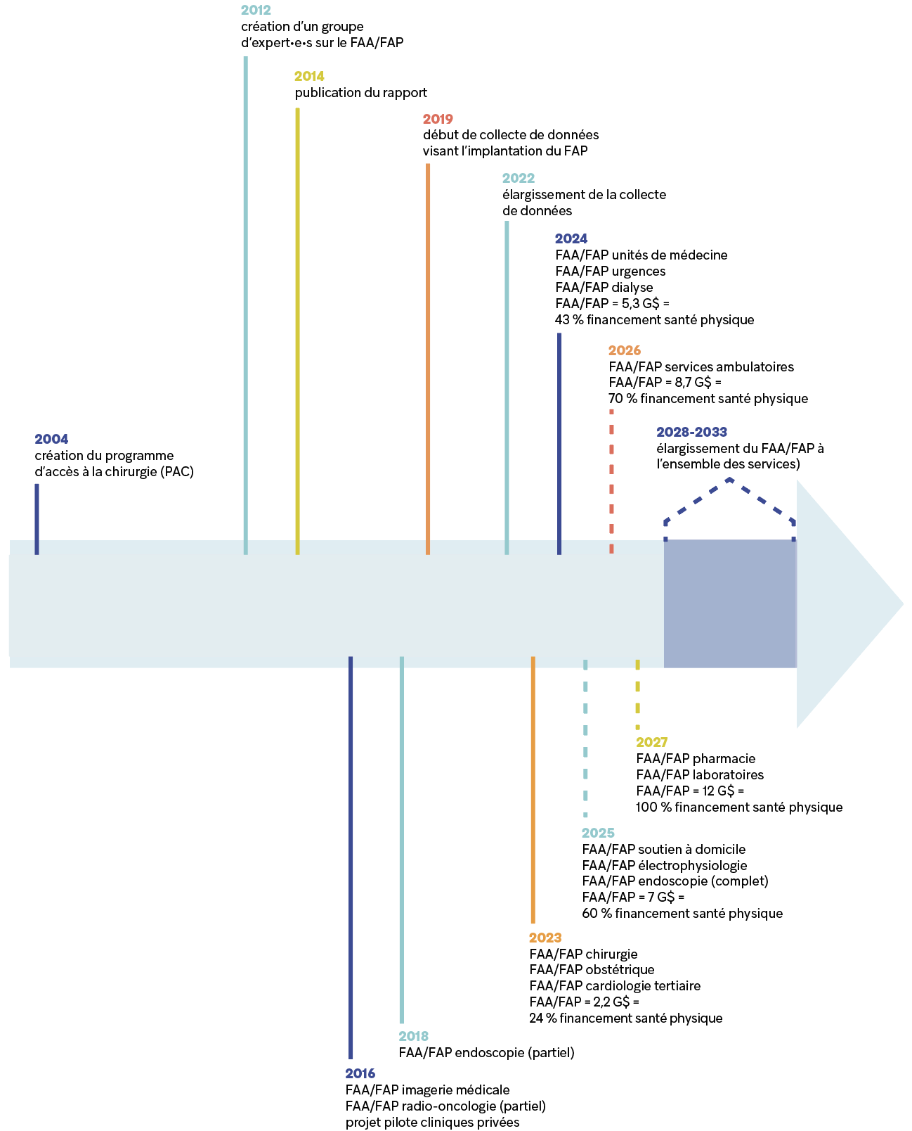 En 2023 et 2024, le déploiement de la réforme s’est poursuivi dans plusieurs secteurs de la santé physique (chirurgie, obstétrique, cardiologie tertiaire, unités de médecine, urgences, dialyse). En 2024, le FAA/FAP totalisait 5,3 milliards de dollars, ce qui représentait 15 % de tous les programmes-services du réseau et 43 % du programme de santé physique23.