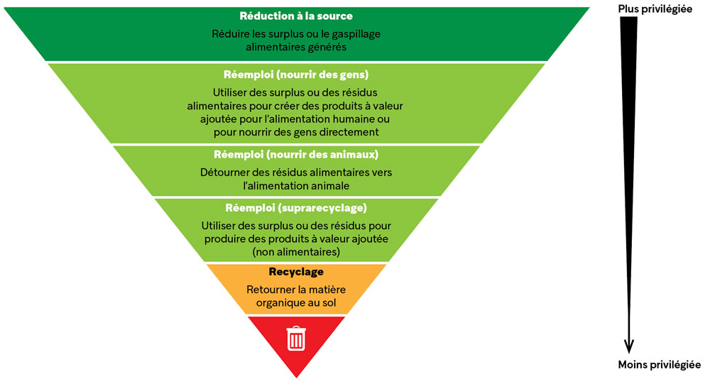 Une représentation de l’enjeu du gaspillage alimentaire fait toutefois largement consensus dans la littérature scientifique et dans les politiques publiques de divers pays : la pyramide inversée de la réduction du gaspillage. Sous une forme ou une autre, avec des variations mineures, elle est reprise dans la plupart des rapports de recherche sur le sujet et a été intégrée aux obligations législatives ou réglementaires dans certains territoires. Cette pyramide stipule que la réduction du gaspillage alimentaire doit privilégier la prévention, c’est-à-dire la réduction à la source (éviter la création de surplus alimentaires) d’abord et avant tout. Si la génération de surplus ne peut être évitée, ceux-ci doivent dans un premier temps être redistribués vers l’alimentation humaine et, dans un deuxième temps, vers l’alimentation animale. Les aliments qui ne peuvent être récupérés doivent être traités en favorisant en ordre d’importance la digestion anaérobie (production de biogaz par la méthanisation), le compostage et l’incinération avec récupération d’énergie. Enfin, seule une petite partie des résidus alimentaires devrait être envoyée aux sites d’enfouissement.